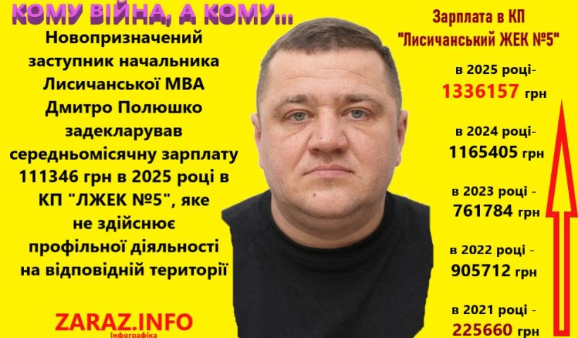Новопризначений(18.03.2026р.) заступник начальника Лисичанської міської війскової адміністрації Луганської області Дмитро Петрович Полюшко згідно декларації в КП «ЛИСИЧАНСЬКА ЖИТЛОВО-ЕКСПЛУАТАЦІЙНА КОНТОРА №5» (яке не здійснює профільної діяльності…
