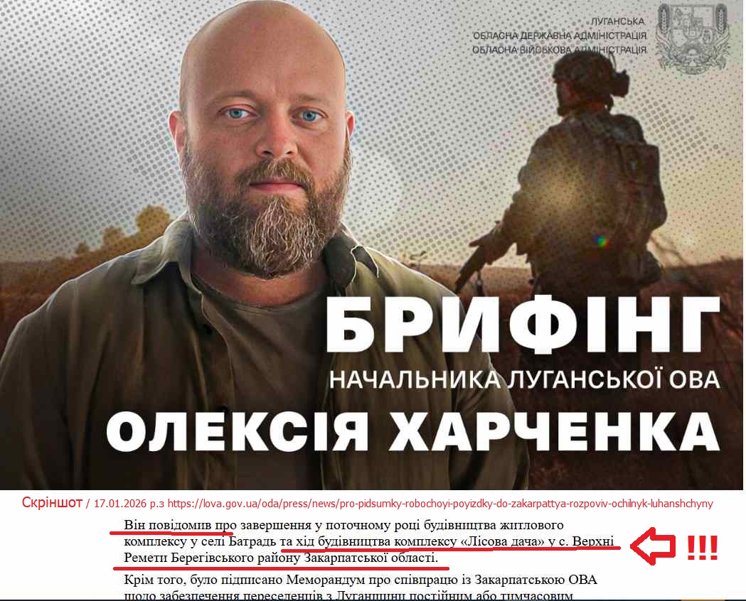 17 січня 2026 року на сайті Луганської ОДА опубліковано офіційне повідомлення, що на брифінгу голова Луганської ОДА Олексій Харченко повідомив про «… хід будівництва комплексу «Лісова дача» у с. Верхні Ремети Берегівського району Закарпатської області». ( Тобто не встигли готовий для користування «об’єкт» купити, а він вже строїться? -ред.)
