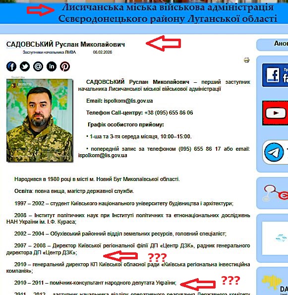 Після публікації 9 лютого 2026р. редакцією ЗАРАЗ.ІНФО інформації про те, що «Зник перший заступник начальника Лисичанської МВА Руслан Садовський«, через добу (але «заднім числом» від 06.02.2026р. — і тут зловживання!!!- ред. ) на сайті Лисичанської МВА з’явились фото і бографія чиновника, в якій є велики часові (і змістовні) прогалени у п’ять років: за період з 2004 по 2007 рік і з 2008 по 2010 рік (дивіться нижче).