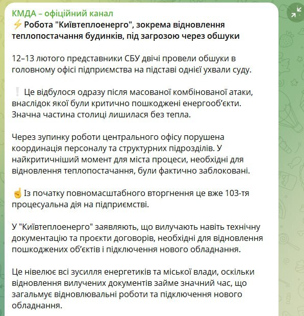 12–13 лютого СБУ двічі навідалася з обшуками до головного офісу «Київтеплоенерго» — в обох випадках на підставі однієї й тієї ж ухвали суду, — КМДА.