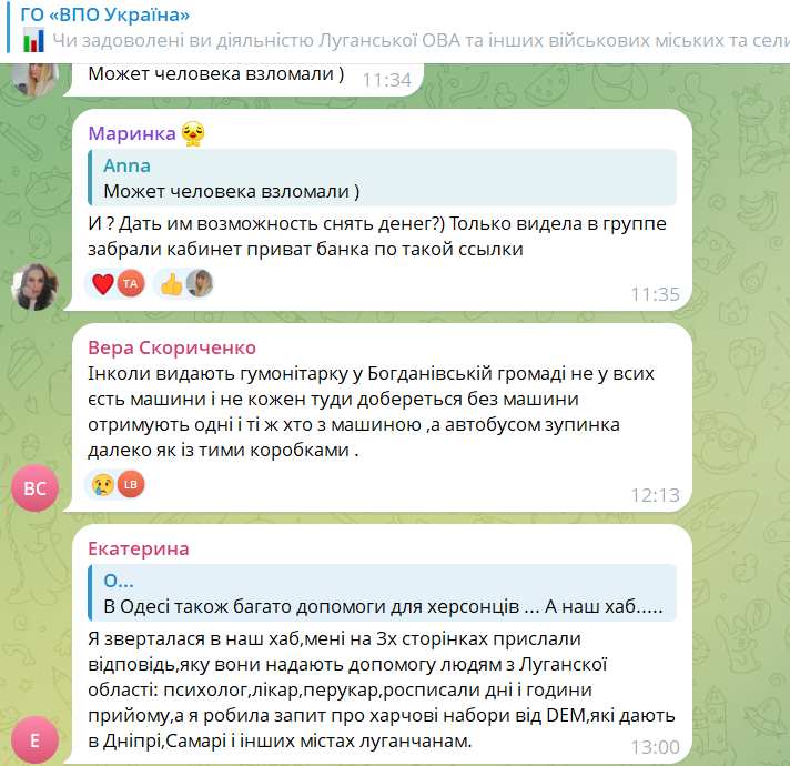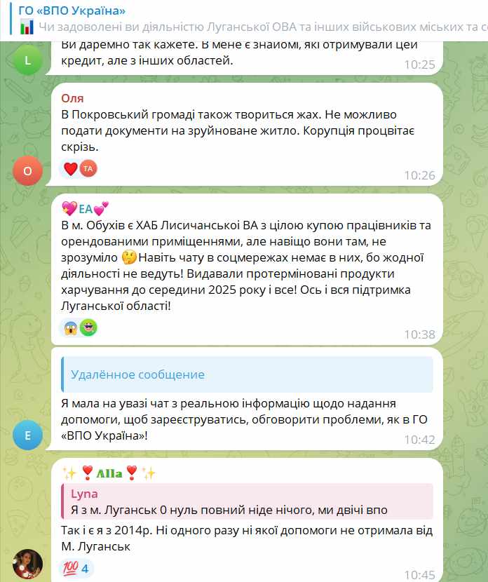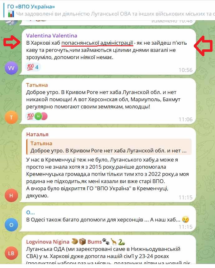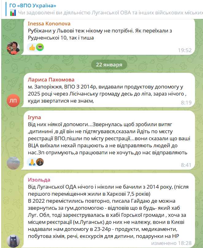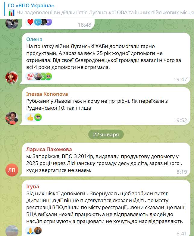 Серед переселенців 56 громадян написили коментарі мотивуючи свою незадоволенність роботою обласної, міських і селищних віскових адміністрацій Луганської області. (дивіться скріншоти).