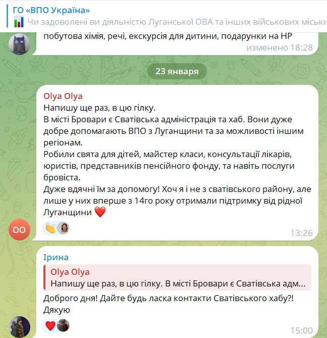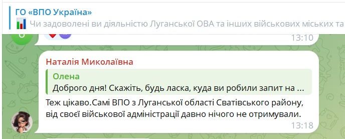 21 січня громадська організація «ВПО України» в телеграм-каналі розпочала опитування громадської думки: «Чи задоволені ви діяльністю Луганської ОВА та інших військових міських та селищних адміністрацій тимчасово окупованої Луганщини?» За десять діб (по 31 січня включно) це питання прочитали близько 40600 осіб, а із 2176 осіб які забажали відповісти проголосували так: 88% — «Ні», 12% — «Так.