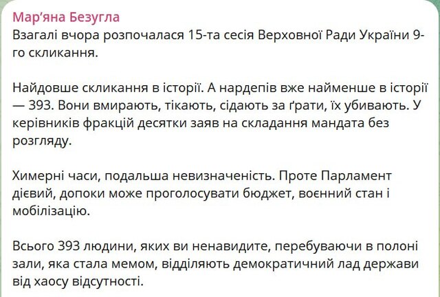 Вона зазначила, що в Раді на зараз залишилося 393 депутати.