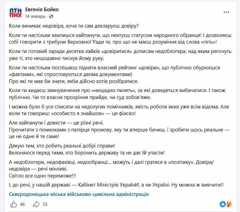 Скріншот з фейсбук-сторінки Євгенії Бойко