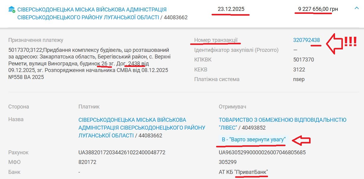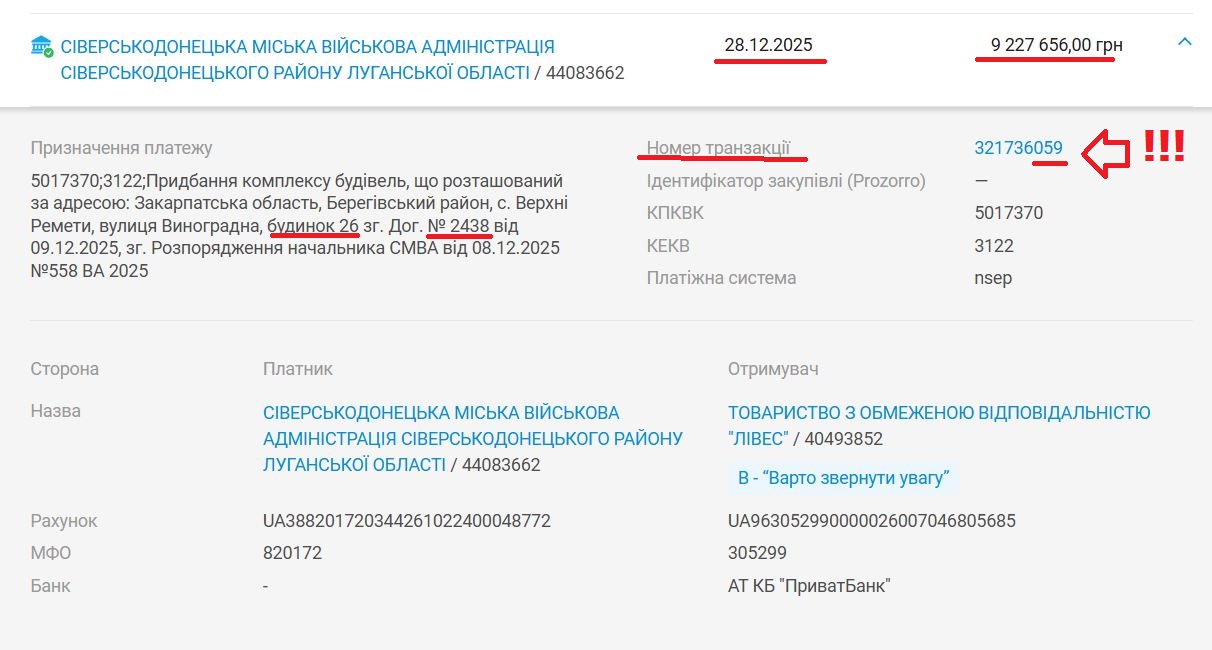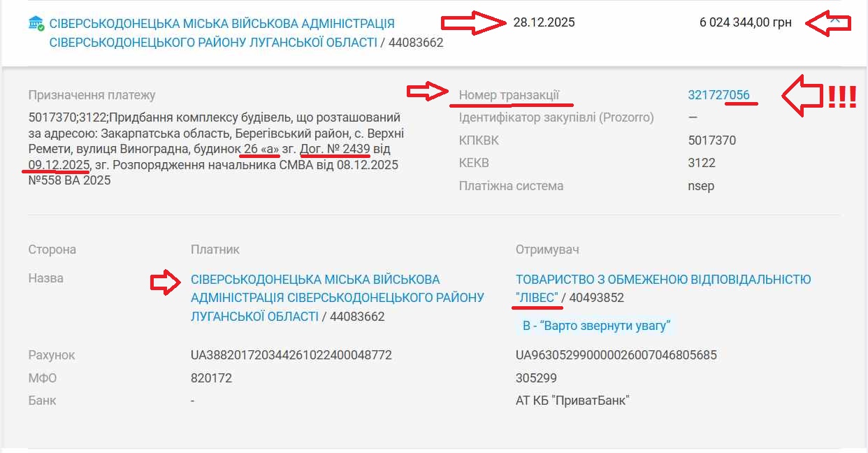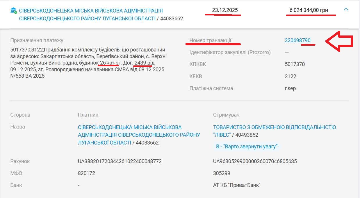 Так, згідно данних Аналітичної системи YouControl за комплекс споруд Сіверськодонецькою МВА було зроблено 4 окремі з різними номерами банковські транзакції (переказ коштів між рахунками) ТОВ «Ліверс» (ЄДРПОУ 40493852), дві транзакції 23.12.2025 року на суму 15, 252 млн грн, і дві транзакції на таку ж суму 28.12.2025р. Загальна сума транзакцій з бюджету для отримувача ТОВ «Лівес» склала 30 млн 504 тисячи гривень. Дивіться нижче скріншоти.