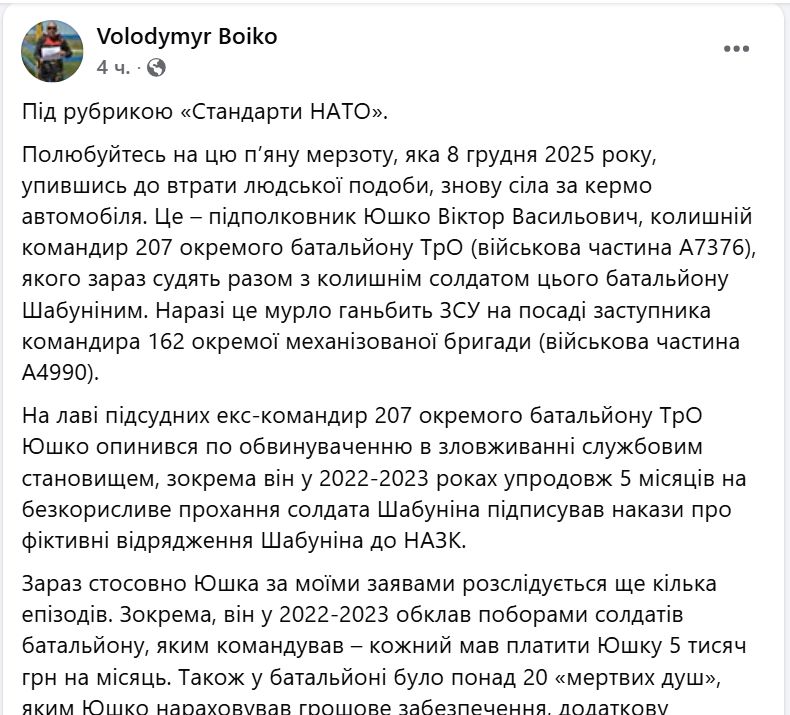 Зараз стосовно Юшка за моїми заявами розслідується ще кілька епізодів. Зокрема, він у 2022-2023 обклав поборами солдатів батальйону, яким командував – кожний мав платити Юшку 5 тисяч грн на місяць. Також у батальйоні було понад 20 «мертвих душ», яким Юшко нараховував грошове забезпечення, додаткову винагороду та «бойові», а гроші привласнював. Наприклад, Шабуніну та Шерембею, які за півтора року фіктивної служби в батальйоні жодного разу не з’явились у своїх підрозділах, Юшко виплатив по 950 тисяч грн кожному.