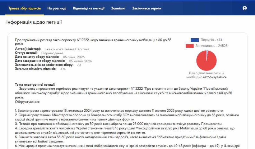 View More Петиція збирає підписи про терміновий розгляд законопроєкту №12222 щодо зниження граничного віку мобілізації з 60 до 55 роківЗАРАЗ.ІНФО