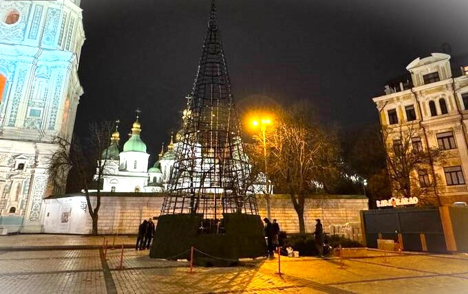 На Софійській площі в Києві почали встановлювати новорічну ялинку.