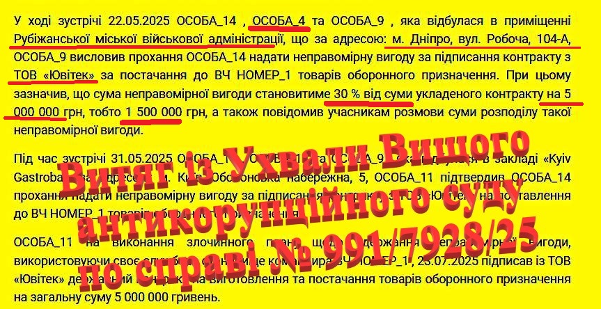 У ході зустрічі 22.05.2025 ОСОБА_14 , ОСОБА_4 та ОСОБА_9 , яка відбулася в приміщенні Рубіжанської міської військової адміністрації, що за адресою: м. Дніпро, вул. Робоча, 104-А, ОСОБА_9 висловив прохання ОСОБА_14 надати неправомірну вигоду за підписання контракту з ТОВ «Ювітек» за постачання до ВЧ НОМЕР_1 товарів оборонного призначення. При цьому зазначив, що сума неправомірної вигоди становитиме 30 % від суми укладеного контракту на 5 000 000 грн, тобто 1 500 000 грн, а також повідомив учасникам розмови суми розподілу такої неправомірної вигоди.