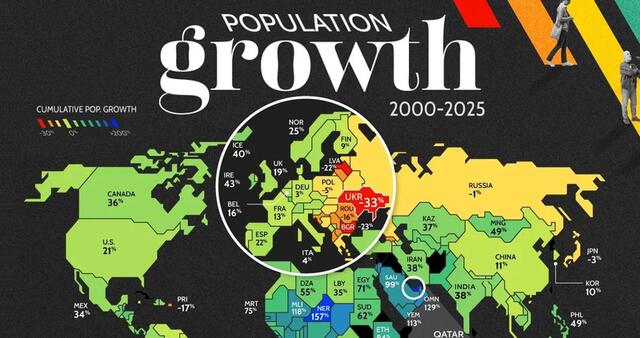 Лідери за зростанням населення за останню чверть століття: Катар (+423%), ОАЕ (250%), Екваторіальна Гвінея (167%).