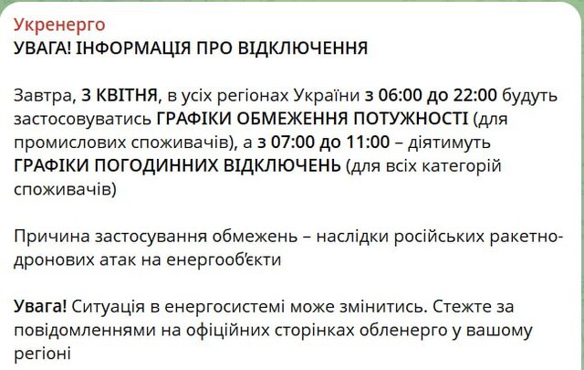 Завтра, 3 квітня по всій країні набудуть чинності графіки відключень: для побутових споживачів – з 7:00 до 11:00, а для промислових – з 6:00 до 22:00.