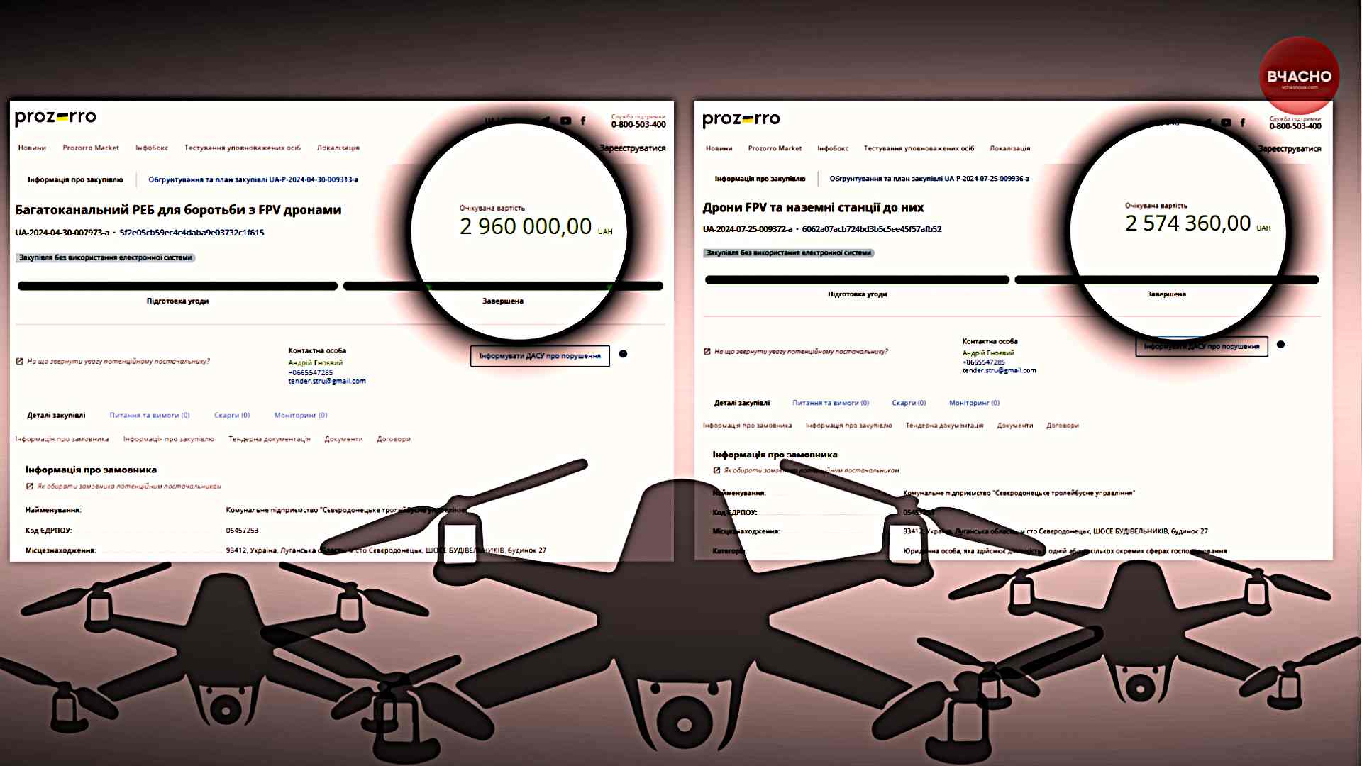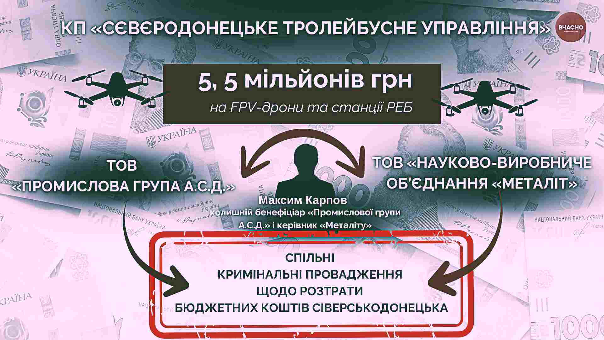 Однак у Сіверськодонецька благородна ідея перетворилася на зручну схему. Під прикриттям оборонних потреб посадовці місцевої військової адміністрації, за даними слідства, разом із керівництвом КП «Сєвєродонецьке тролейбусне управління» організували ймовірно фіктивні закупівлі FPV-дронів і станцій радіоелектронної боротьби (РЕБ).
