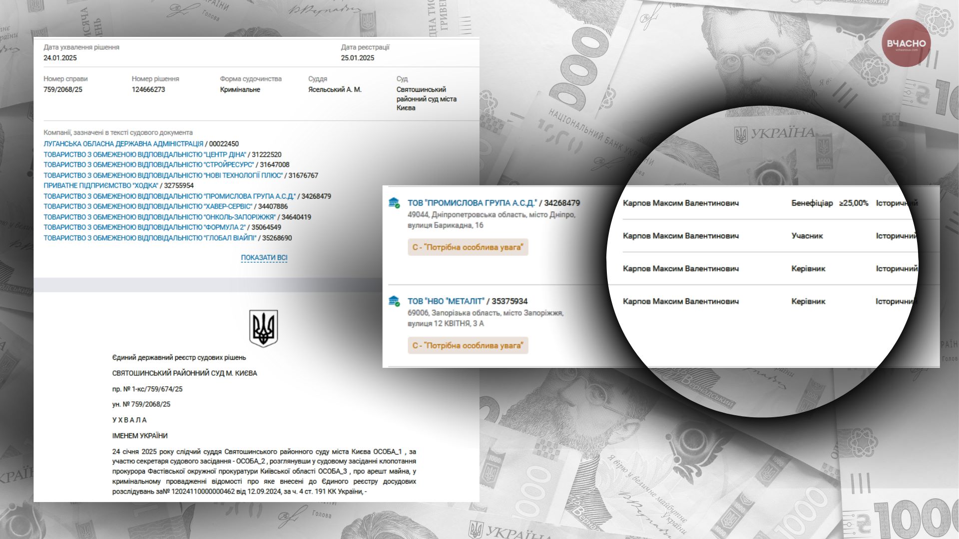 Аналіз відкритих реєстрів підтверджує, що обидві фірми з’єднує спільна фігура — Максим Карпов, колишній бенефіціар «Промислової групи А.С.Д.» і керівник «Металіту». Наразі чоловік керує ТОВ «Укргідросервіс», зареєстроване у Дніпрі зі статутним капіталом лише тисяча гривень. КП «Сєвєродонецькводоканал» уклало з цим підприємством контрактів на понад 2 млн грн. Така повторюваність прізвищ і зв’язків створює чітку картину — мова йде не про окремі фірми, а про ланки однієї мережі.