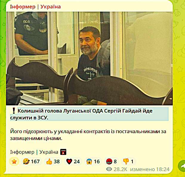 «Колишній голова Луганської ОДА Сергій Гайдай йде служити в ЗСУ»,- повідомляє телеграм-канал «Інформер. Україна», але при цьому не надав джерело підтвердження інформації.