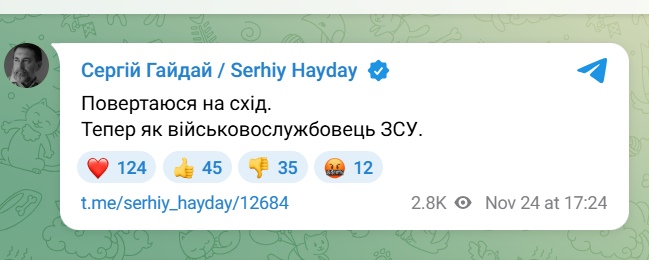 Джерелом підтвердження цієї інформації є телеграм-канал безпосердньо фізичної особи Сергія Гайдая, де замовкнувший майже на 4 місяці з моменту затримання на хабарі з 2 серпня 2025 року «герой Ронін» вистрілив наступну пафосну інофрмацію: «Повертаюся на схід. Тепер як військовослужбовець ЗСУ». Цю інформацію вже встигли рознести деякі ЗМІ.