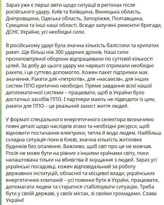 Зеленський заявив, що вночі під російський удар потрапили Київ та Київська область, а також Вінницька, Дніпропетровська, Одеська, Запорізька та Полтавська області. Водночас повідомлялося про влучання в Рівненській області, яку президент не згадав.