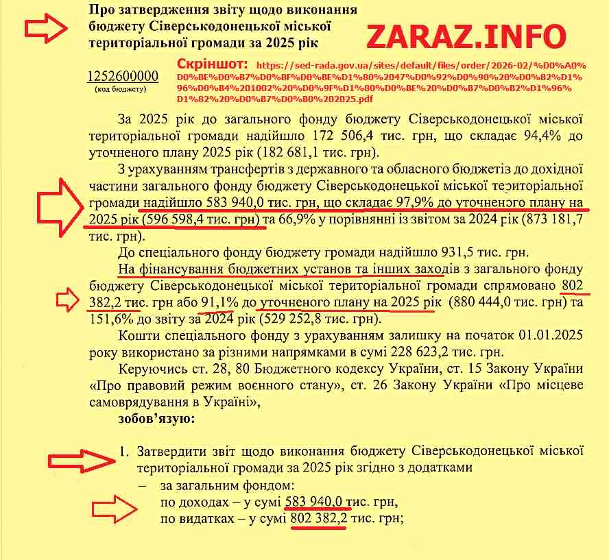 Згідно затвердженного звіту бюджету Сіверськодонецької міської територіальної громади за 2025 рік видатки склали 802 382 200 грн, а доходи 583 940 000 грн. Тобто видатки над доходами перевищили на 218 444 200 грн, при тому що, первинно бюджет (на протязі року його змінювали- ред.) був запланований на рівні 596 598 400 грн ( дивіться скріншот і посилання на документ).